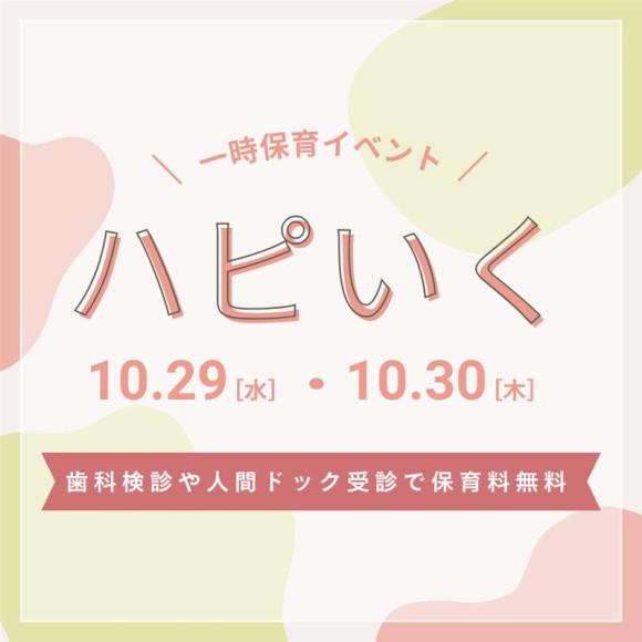 一時保育検索・予約サービス「あすいく」が主催する一時保育イベント「ハピいく」を開催します。年齢に合わせたおもちゃや絵本をご用意し、経験豊富な保育士が安心・安全にお子様をお預かりします。家事や育児の息抜きに、ゆったり映画鑑賞やショッピング、ランチなどにもぜひご活用ください。メディカルモールWelpa内クリニックで検診・健診を受診される方には先着で保育料無料サービスも実施します。