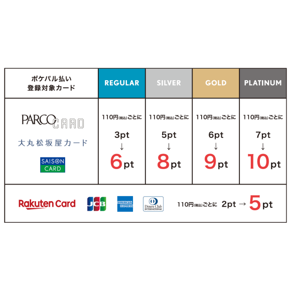 ※PARCOメンバーズランク・ポケパル払いにご登録のクレジットカードによってPARCOポイント付与数は異なります。