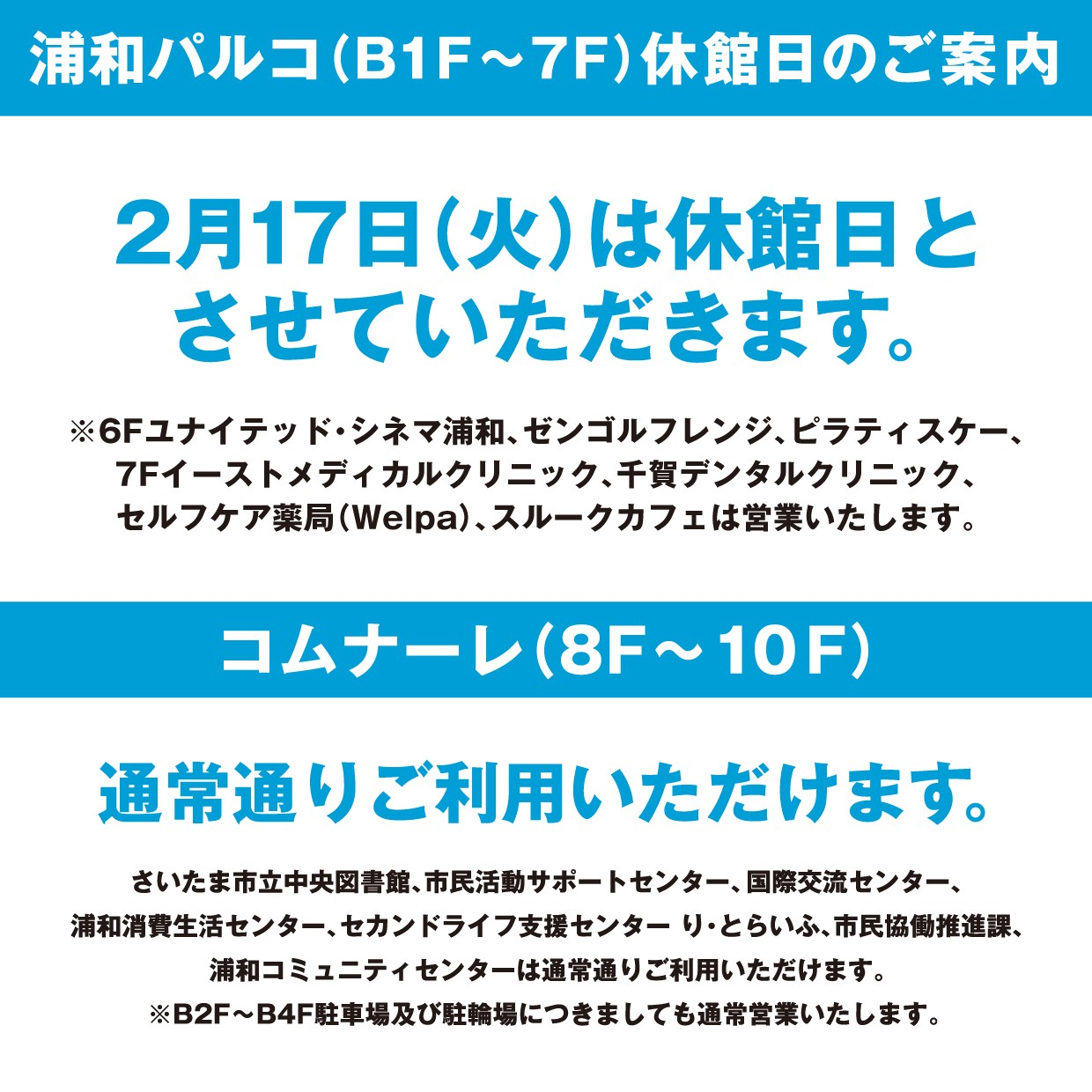 誠に勝手ながら浦和PARCOは、2月17日(火)を全館休館日とさせていただきます。