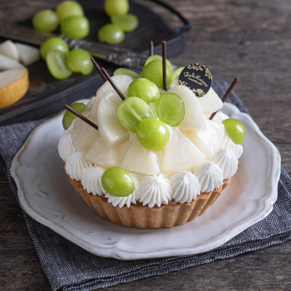 カスタードタルトにアプリコット洋梨ジャムをしのばせ、マスカットクリームを重ね、みずみずしい和梨とシャインマスカットを飾りました。