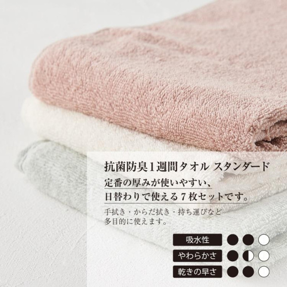 買い足しやお試しにご利用いただける1週間タオル「1日分」 抗菌防臭フェイスタオル 34×80cmもご用意しております。
