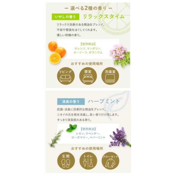 香りは2種、お店のプロモーションの人気の香りと消臭効果の高いハーブミントの香り、コンパクトなサイズで詰め替えもご案内しておりますので