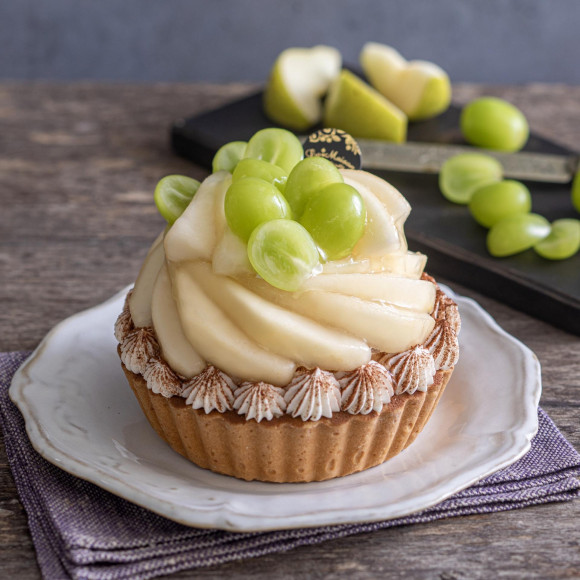 芳醇な香りのラ・フランスと爽やかなシャインマスカットを飾ったタルト。タルトに華やかな香りの青山椒をアクセントにしたいちじくカシスジャムをしのばせ、ヘーゼルナッツクリームを重ねました。