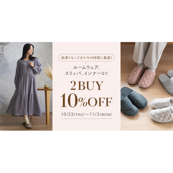 対象のルームウェア・スリッパなど2点以上の購入で10%OFFを開催しております!