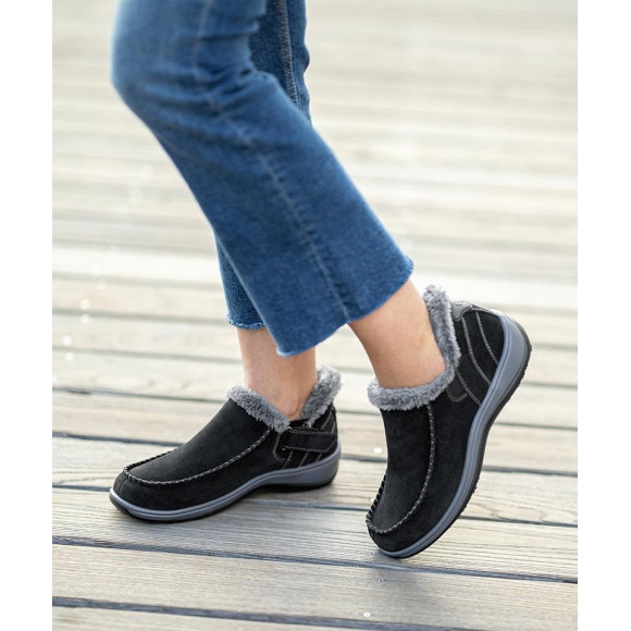 フェイクファーをライニングにほどこしたLORIN/ロリンが、ハンズフリーシューズのラインナップに仲間入り。ファー使いが足を暖かくし、刺激から守り、優しい履き心地を提供します。しなやかな撥水スエードのアッパーが、足全体を締めつけないフィット感を実現。ハンズフリー機能により、立ったまま屈まずに脱ぎ履きが可能なだけでなく、滑りにくいアウトソールの採用により、安定性のある歩行も可能に。”オトナ可愛い“ルックスのスリッポンは、ブラックやブラウンのウールコートに合わせれば、ホリデーシーズンのちょっとしたお出かけにも活躍。