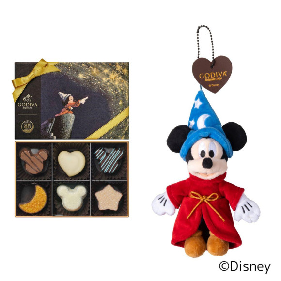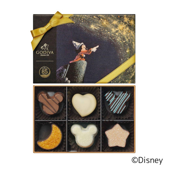 アソートメント 6粒入とミッキーデザインチャームのスペシャルなセット。『ファンタジア』に登場する、魔法使いの弟子に扮したミッキーにGODIVAのタグがついたチャームはこのコレクションだけの限定アイテムです。