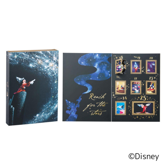 ブック形の8days カウントダウンカレンダー。本を開くと作品中の1コマが描かれた8つの扉が出現します。ミッキーアイコンをかたどった3種類の限定チョコレートやG キューブなどを、毎日1つずつ楽しめます。クリスマス当日には、『ファンタジア』公開85周年を記念して特別にデザインされたミッキーデザインの限定ピンバッジをプレゼントします。