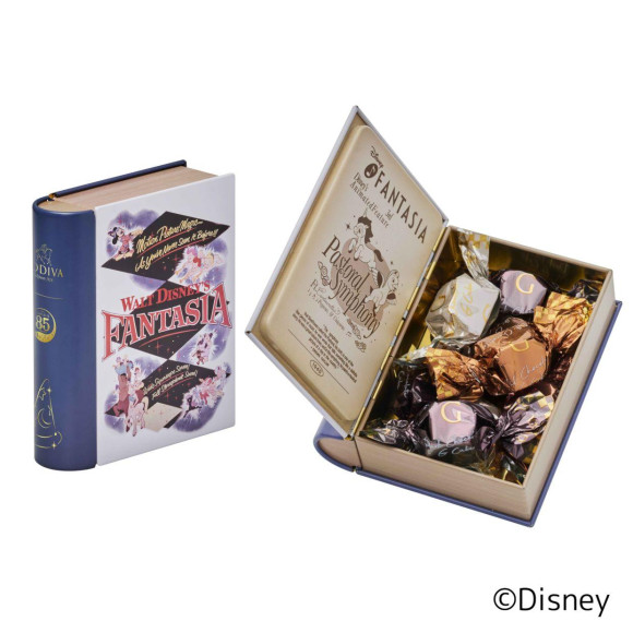 『ファンタジア』のポスターアートを配して、古い洋書をイメージしたブック形の缶に、ミルク、ダーク、ホワイトチョコレートプラリネのG キューブを合計8粒詰め合わせました。