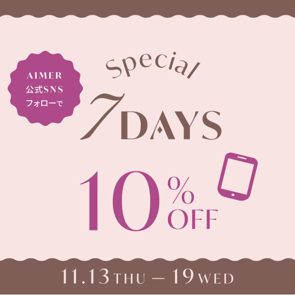 11/13〜11/19までの7日間、SNS(Instagram、LINE、TikTokのどれか)をフォローしていただくと、店内商品を10%オフさせていただきます!♡