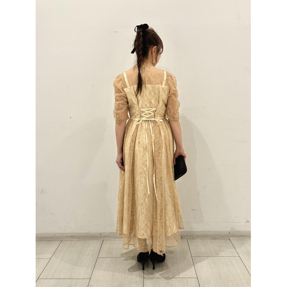【ラメレースギャザースリーブレースアップフィット&フレアドレス】