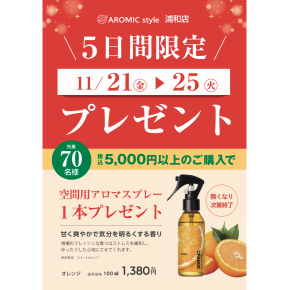 AROMIC style 浦和店では、11月21日(金)〜25日(火)までの5日間限定で、特別なプレゼントキャンペーンを開催します。