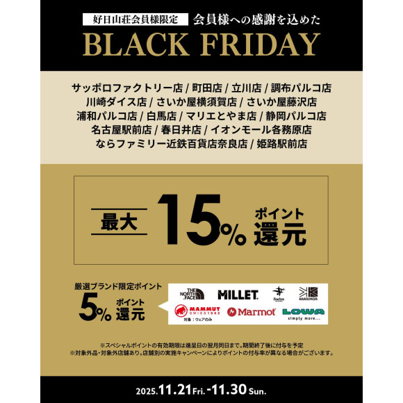 人気ブランドのノースフェイス、ミレー、マムート(ウエアのみ)、マーモット、カリマー、フォックスファイヤーのアイテムご購入でメンバーズポイントを10%還元いたします