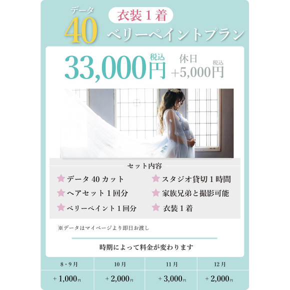 マタニティ用の衣装や小物も豊富に取り揃えており、露出が苦手な方にもお選びいただける衣装もございます。