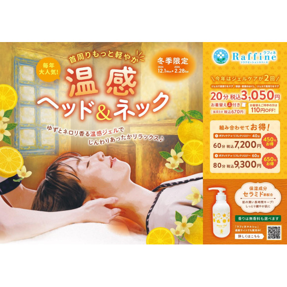 今年はジェルケア2回にパワーアップ!首まわりがよりほぐれ、ジェルの香りもいっそうお楽しみいただけます!