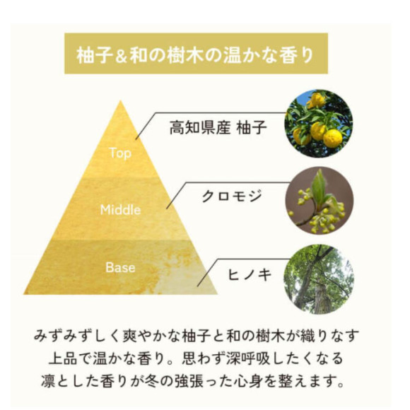 トップに感じるゆずの明るい香りに、スパイシーで深みを添えるクロモジ、そしてやさしく包み込むヒノキが調和。