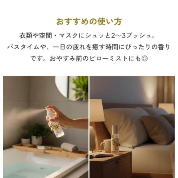 100%天然精油だけでつくったピュアな香りのため、気分転換やリラックスタイムにも最適。
