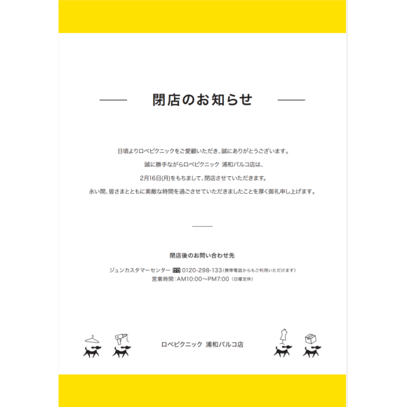 ロペピクニック浦和パルコ店は、2026/2/16(月)をもちまして、営業終了となります。 長らくご愛顧いただきまして誠にありがとうございました。 閉店後のお問い合わせ先は以下となりますのでご案内申しあげます。 <閉店後のお問い合わせ先> ジュンカスタマーセンター(10:00~19:00 日曜定休) TEL: 0120-298-133