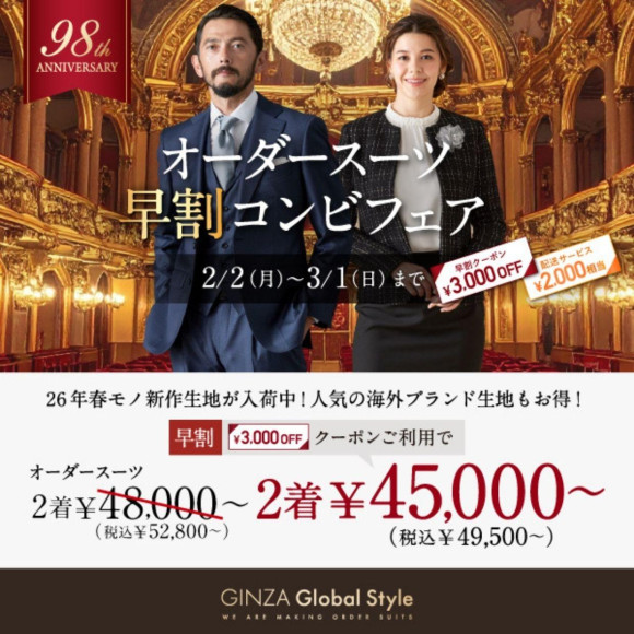 3/1までの期間限定!オーダースーツ2着で合計5,000円相当プレゼント