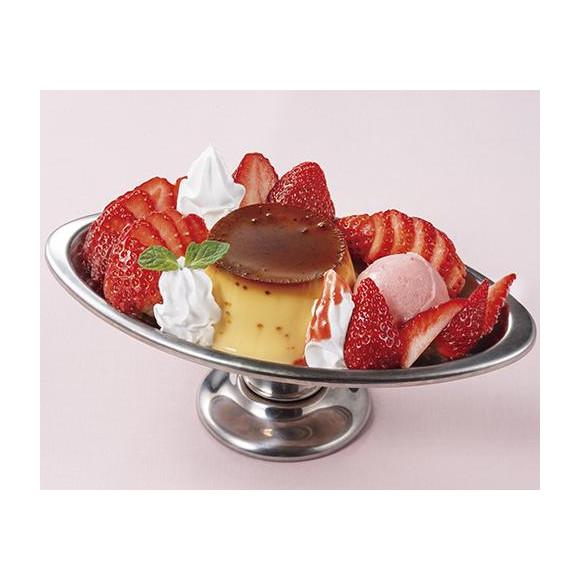 人気の手作りプリンをたっぷりの苺で華やかに盛り付けた、見た目も華やかな苺たっぷりのプリンアラモードです!