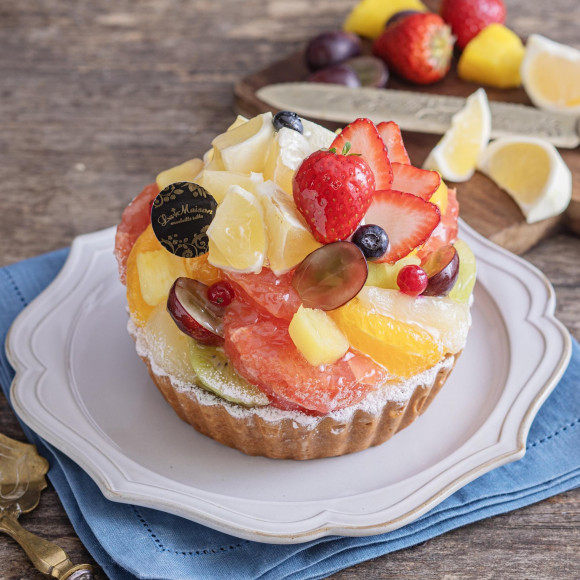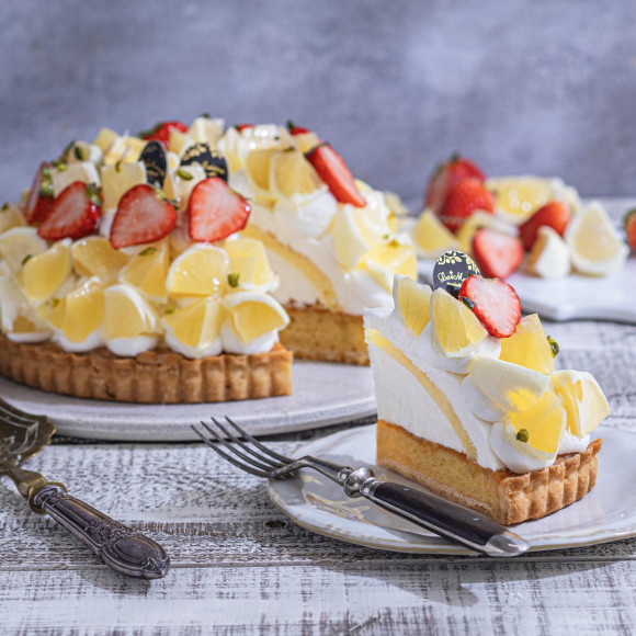 香ばしいアーモンドタルトにカスタードクリームとホイップクリームを重ね、いちごジャムをアクセントにしのばせました。甘く爽やかな酸味の日向夏とあまおうなど10種類のフルーツを贅沢に使用し、彩り鮮やかに飾りました。