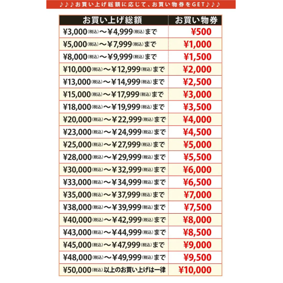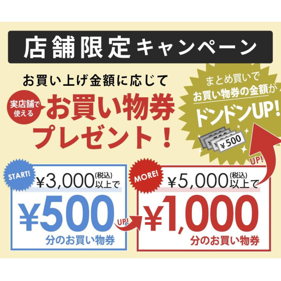 3/18(水)〜22(日)の期間限定でお買い上げ金額ごとにお買い物券をプレゼント中です♪