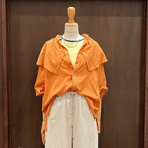 存在感抜群のケープ付きのデザインが目をひくブラウス。