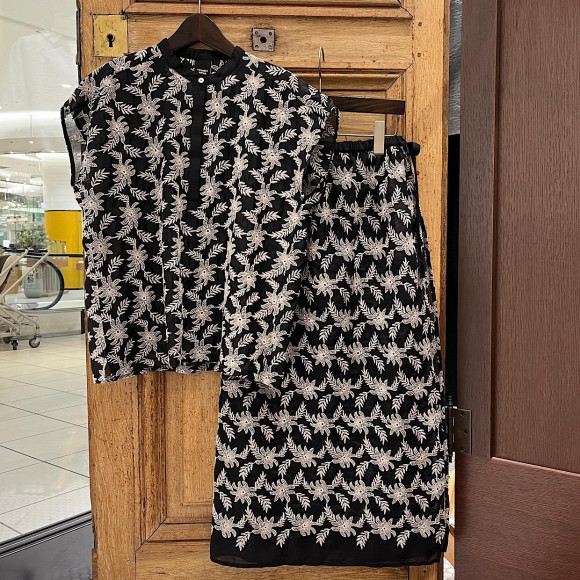 モノトーンフラワー刺繍 フレンチブラウス&レイヤードスカート