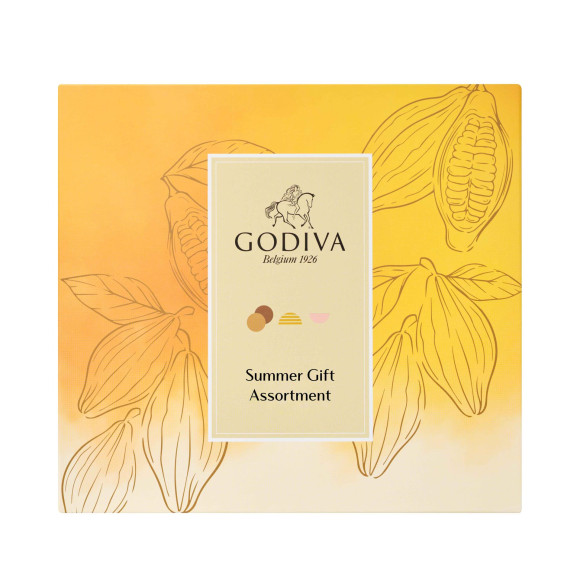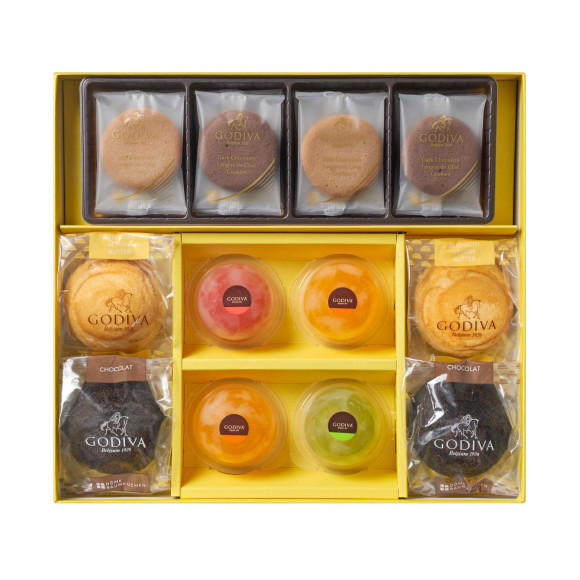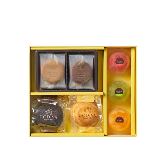 ゴディバで人気の「カカオフルーツ ジュレ」「ラングドシャクッキー」「ドームバームクーヘン」の3種を色とりどりにアソートしました。夏の爽やかさをグラデーションで表現した限定パッケージに詰め合わせました。