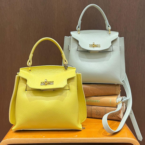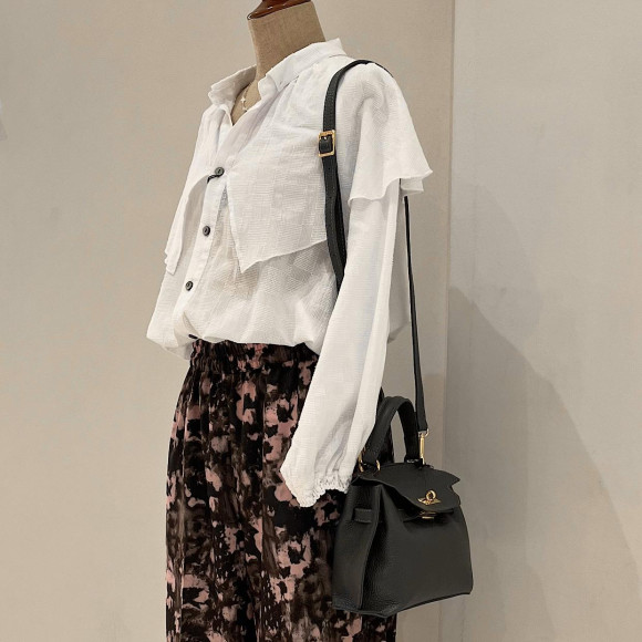 やわらかなシボレザーに控えめに光るゴールド金具をあしらったミニバッグは、オンオフ使えるサイズ感が◎